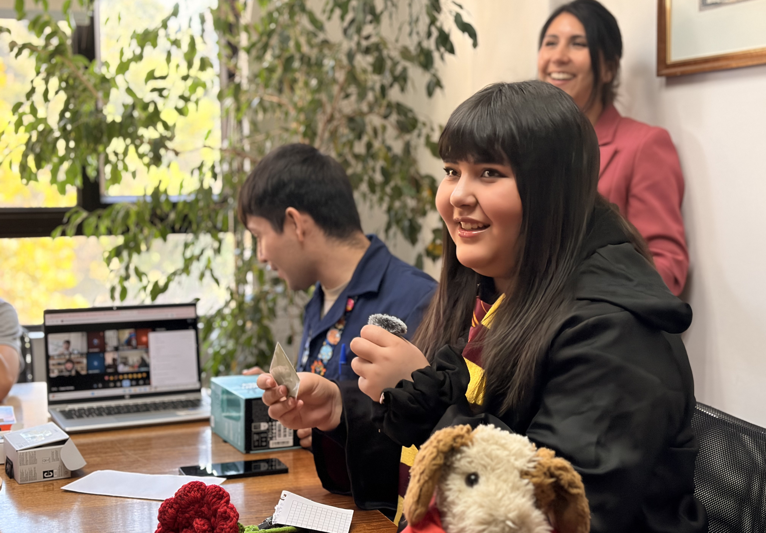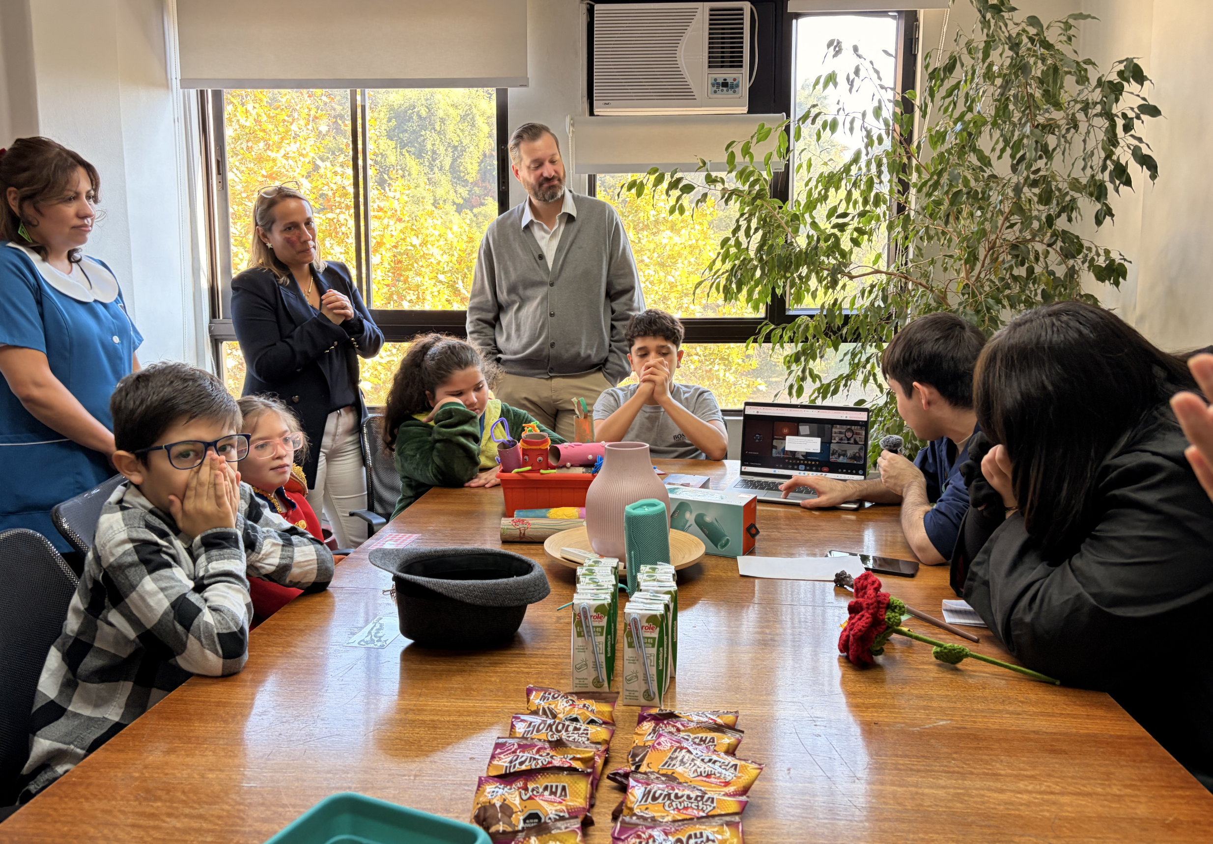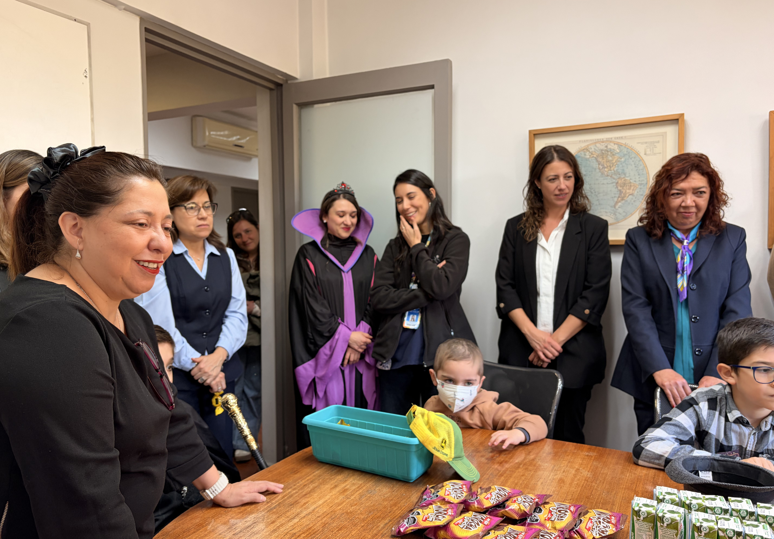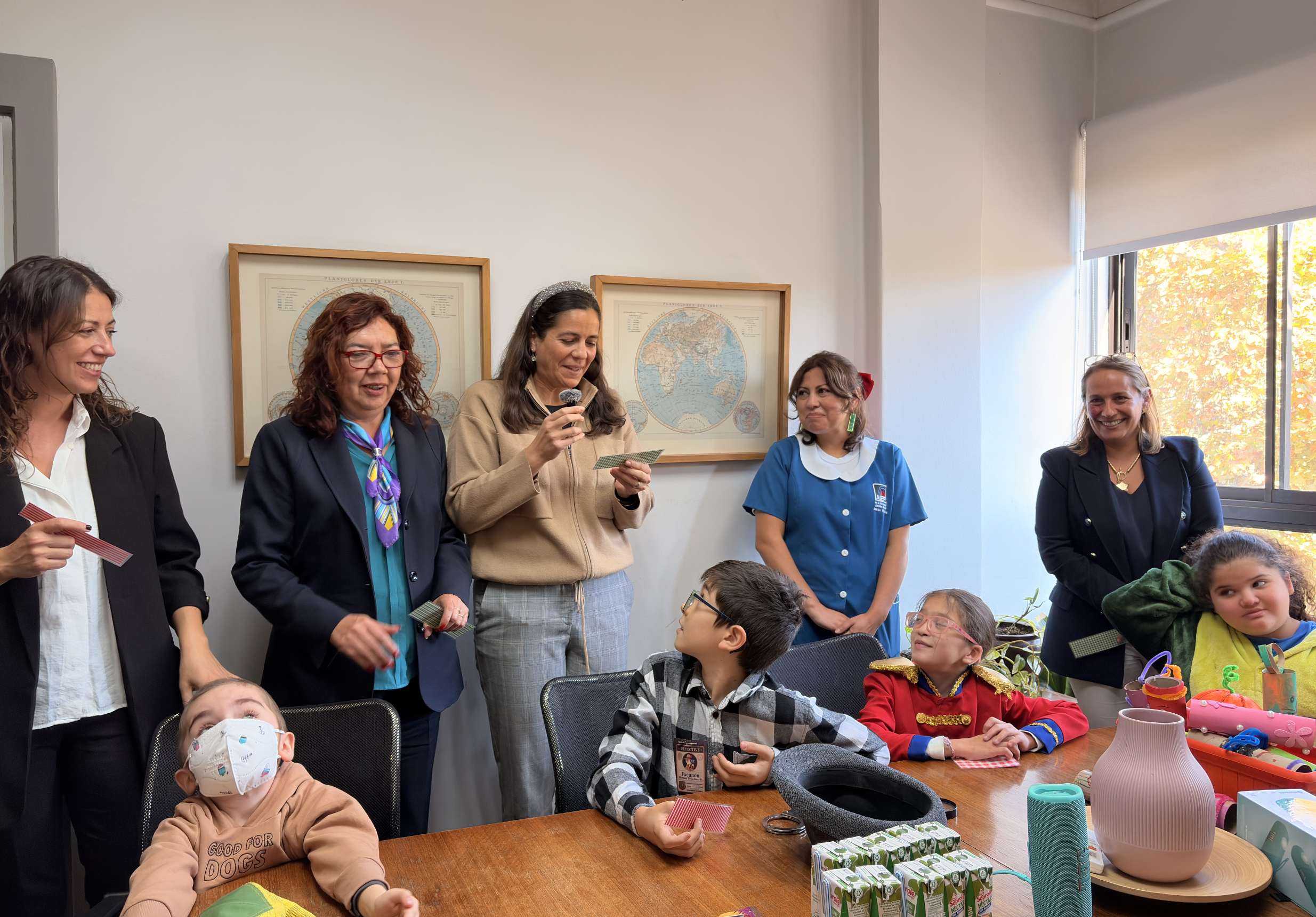 La actividad se desarrolló en formato híbrido. Ocho alumnos participaron de manera presencial, todos disfrazados junto a sus profesoras. Otros estudiantes se conectaron a distancia, desde sus hogares o desde el hospital, y también fueron parte de la jornada.